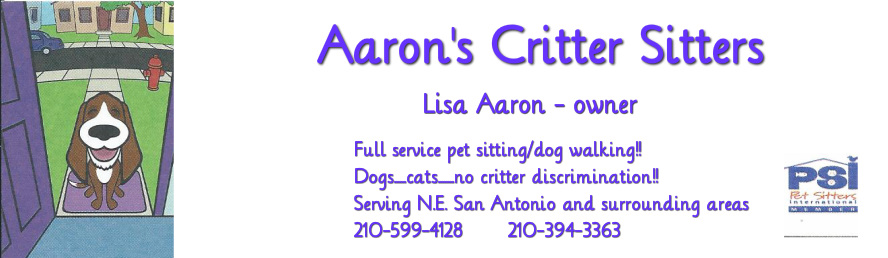 Lisa A. is the owner of Aaron's Critter Sitters in San Antonio and can be reached to make an appointment at 210.559.4128 or 210.394.3363. The Business is a member of the Pet Sitters International, Pet Saver Organization, and Aaron is a PetTech Certified CPR and First Aid trained professional for pets. Aaron cares for dogs, cats and other pets as well - no critters are descriminated. She loves to care care of them all when you aren't able to. the company is bonded and insured for your home and pets safety and professionalism. Fees for pet sitting and dog walking are extremely competitive compared to other businesses in San Antonio. Services can be booked for overnight stays, ongoing, routine dog walking and customized pet sitting while you are away.