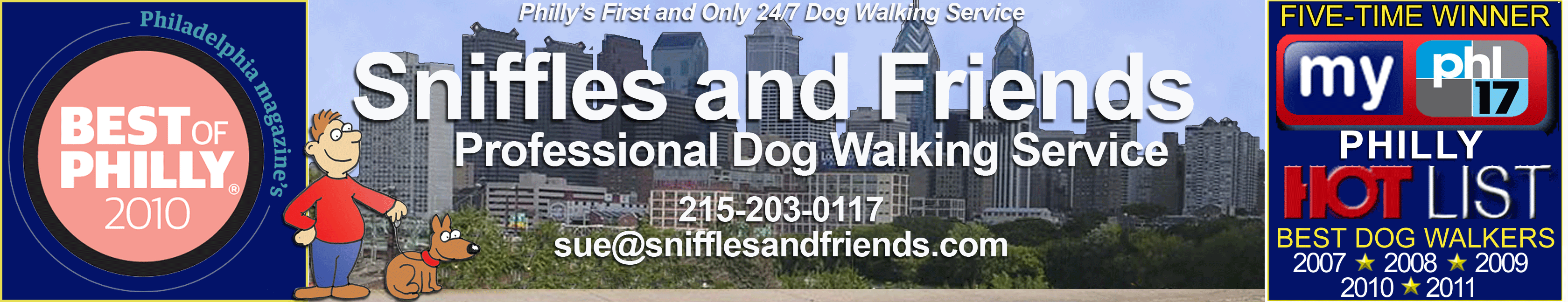 In August 2010, Sniffles and Friends was named the "Best Dogwalking Service" in Philadelphia by Philadelphia Magazine. We ALWAYS offer one free walk per week to all regularly scheduled Monday through Friday mid-day dog walking clients! Voted 2007's, 2008's, 2009's, 2010's, and 2011's BEST DOG WALKING SERVICE in the City of Philadelphia and Surrounding Areas by MyPHL 17 TV's viewers on the PHL Hot List! Dog walkers that are trained, experienced, and educated Sniffles and Friends offers American Red Cross Pet CPR and First Aid training and certification as well as classes with one of Philadelphia's most respected and knowledgeable animal trainers to all employees, most of whom are veterinary, medical, and/or pet care professionals!