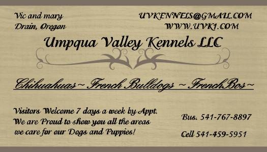 Beautiful, Healthy Puppies at reasonable prices! Our website has Video, MANY Pictures, Care and Breed info and more! It is a great site for you to use as a research tool or reference if you are interested in any of these breeds / or the FrenchBo hybrids. Check out our "virtual tour"! Our Chihuahuas come in ALL colors ( yes even blue and lavender!) Long and short coats. Our French Bulldogs come in many colors too and we offer stud service and Artificial insemination. The FrenchBo Hybrids are also known as Frostons, Frenchtons, Faux French Bulldogs, Boston Frenchies. They are Parented by one purebred Boston Terrier and one purebred French Bulldog. We do not ship cargo but do offer a "hand " delivery service for all of USA and Canada, at a very reasonable charge. Mary 541-459-5951